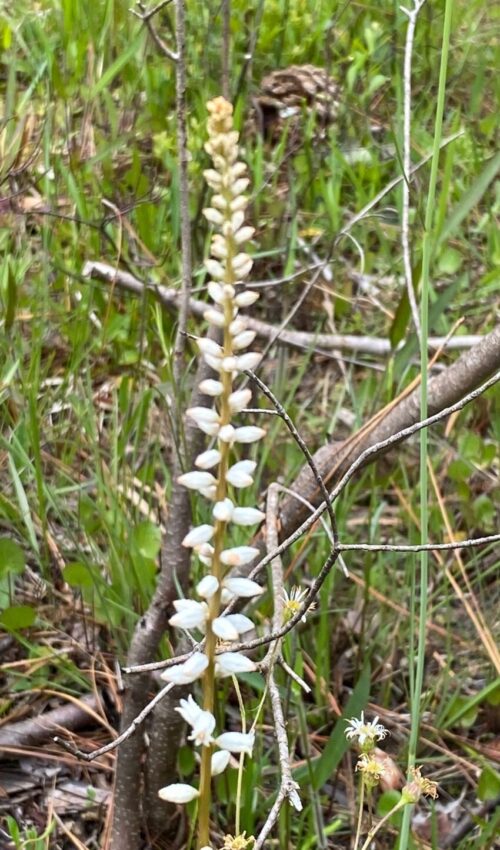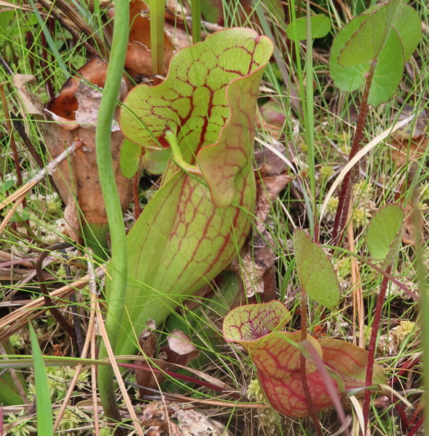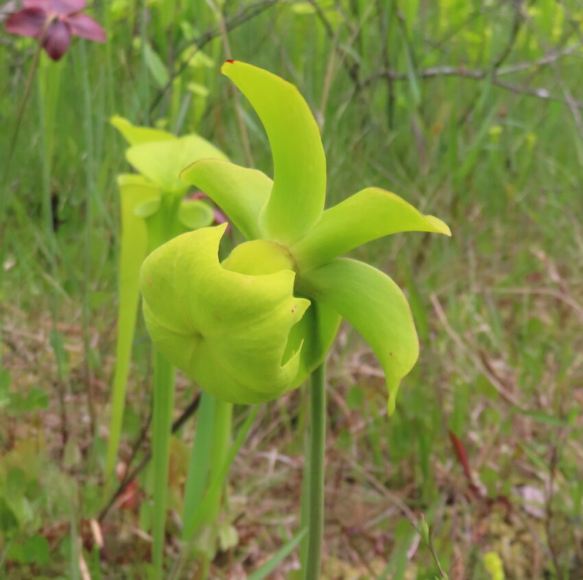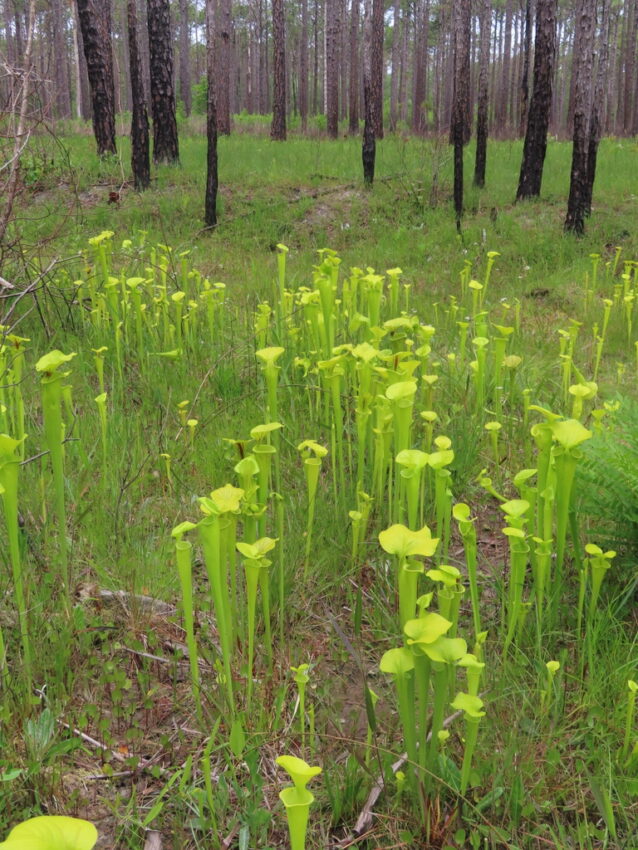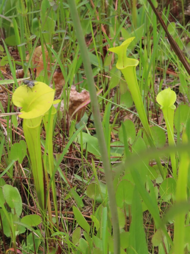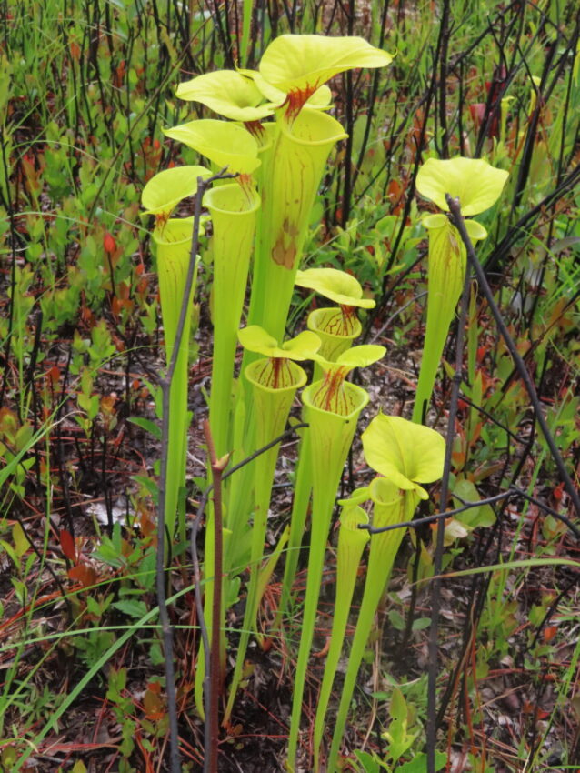 I thought it would be really hard to find the carnivorous plants thinking (I don’t know why) that they were like morel mushrooms and you never knew where they would show up. And I would have to wander aimlessly through the woods looking for them. That was not the case! They were just off the road. As I was driving in I could see that the forest had been burned this year, at least the part I was in. This helps the plants thrive and also makes it easier to see the plants and walk into the woods to them. More about that later. The easiest ones to spot were the green pitcher plants with their chartreuse green color, and the fact that they are tall.