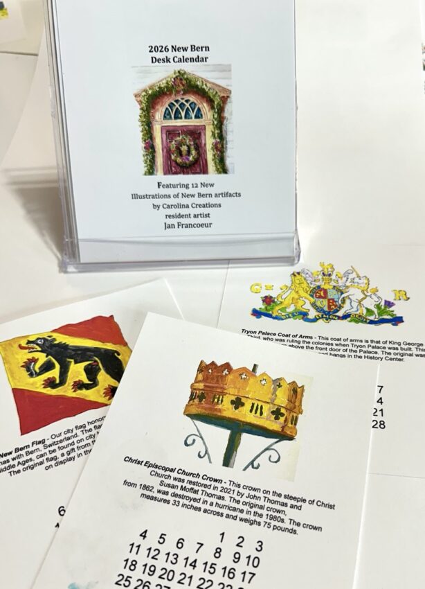 Every year I do 12 New Bern paintings of some sort for my cd case calendar. This year instead of doing paintings of just buildings I decided to paint some of the things around town you have to look closely to see. I did them in gouache this year. Sometimes I do them in oil, or watercolor, or on clay like this years Christmas card.
