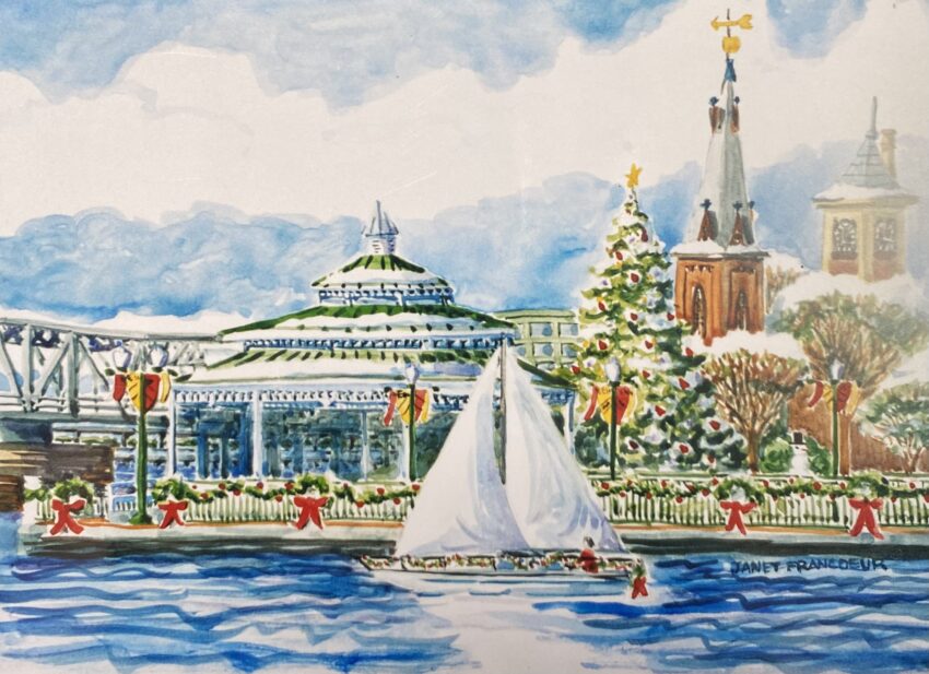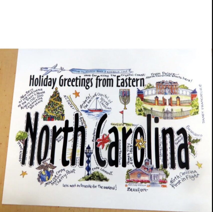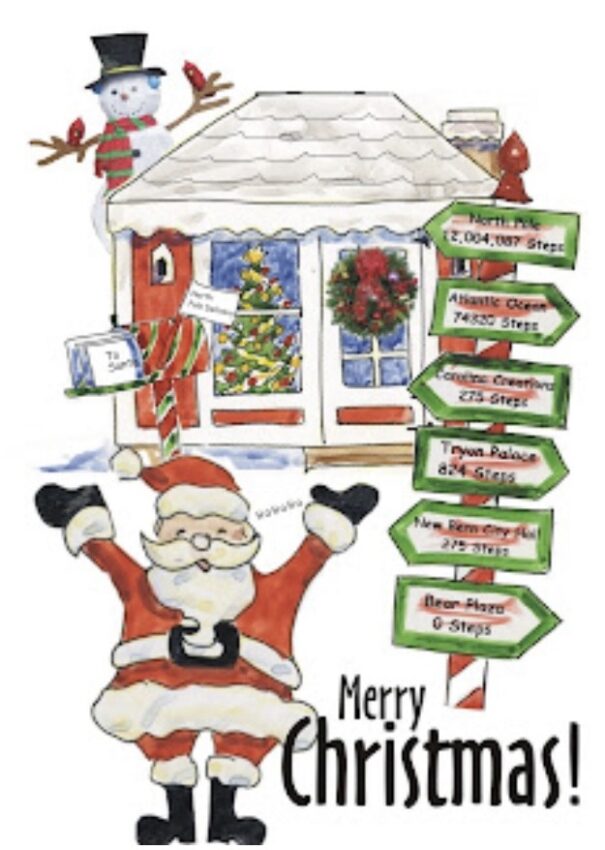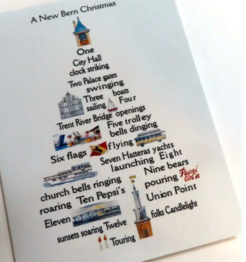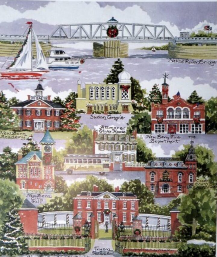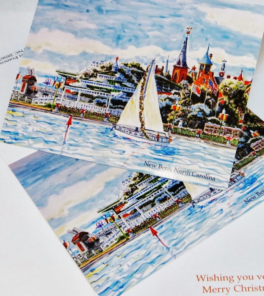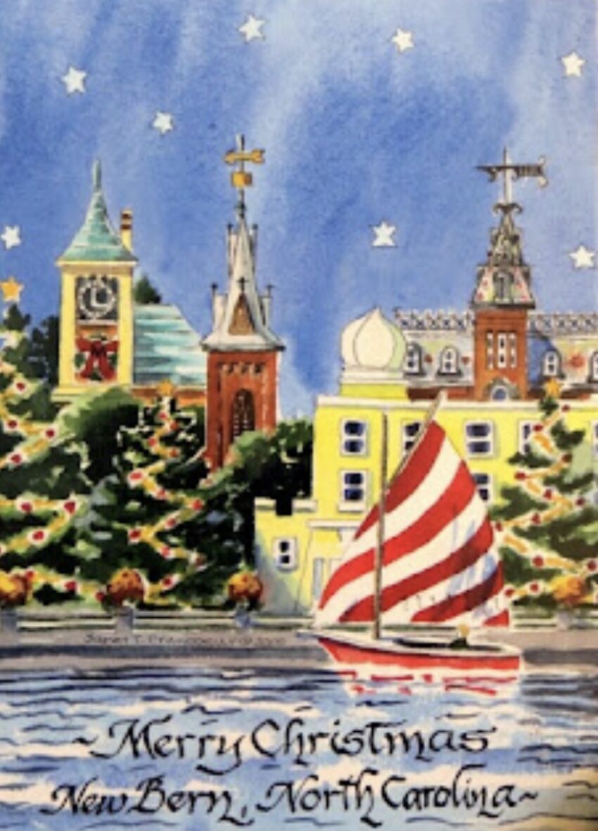 I have been doing New Bern Christmas cards every year since 1990. Here are some of them! I’ve done them with watercolors, ink, underglazes on clay, mixed media, collage, etc! I’m always experimenting and trying new things. Someone suggested I do some with snow…. I think I have!