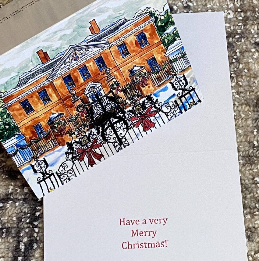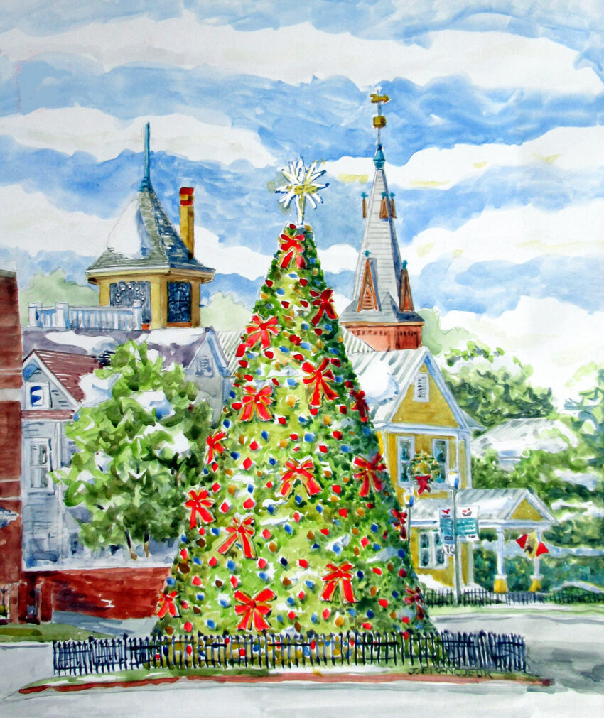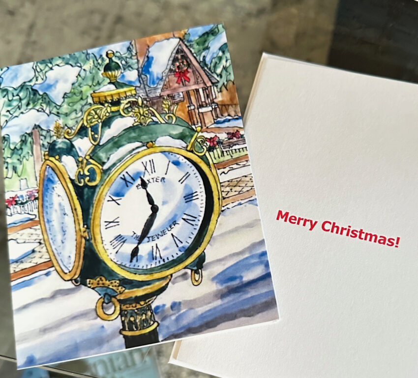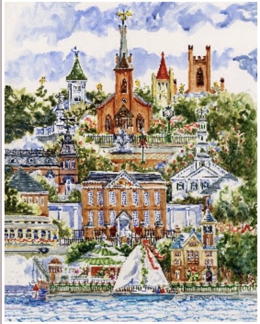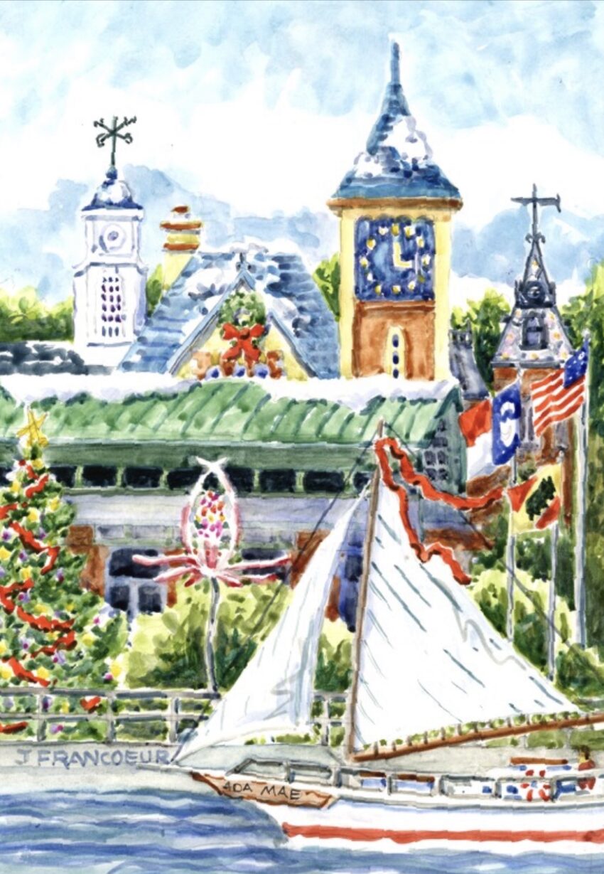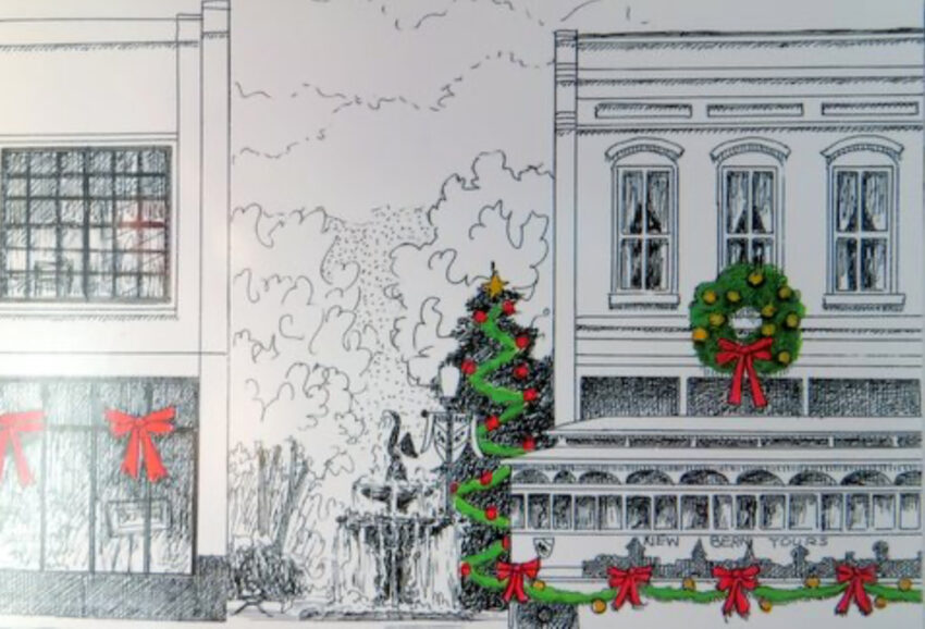I have been doing New Bern Christmas cards every year since 1990. Here are some of them! I’ve done them with watercolors, ink, underglazes on clay, mixed media, collage, etc! I’m always experimenting and trying new things. Someone suggested I do some with snow…. I think I have!