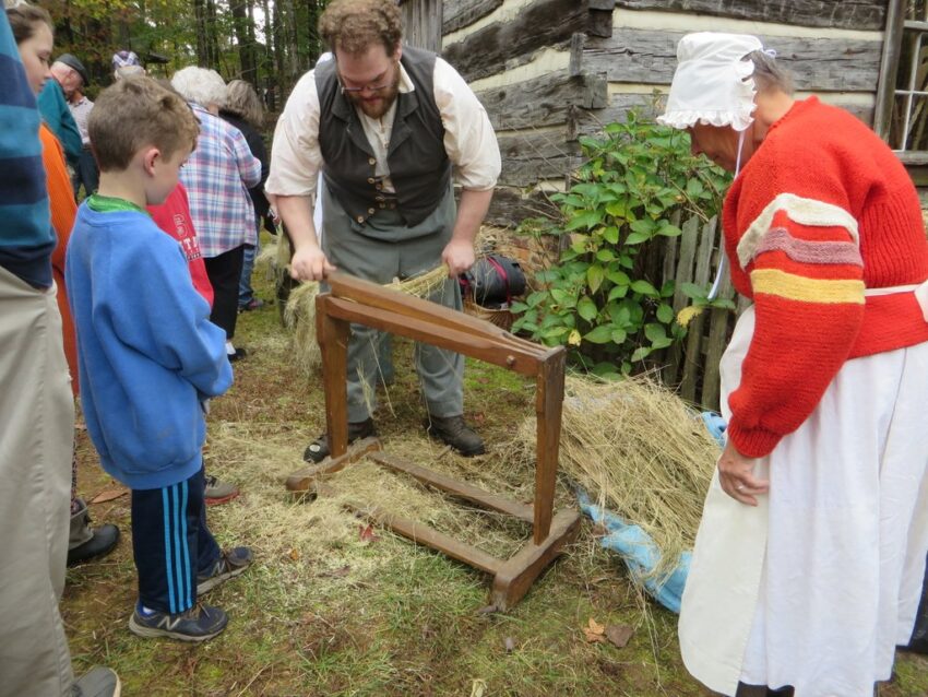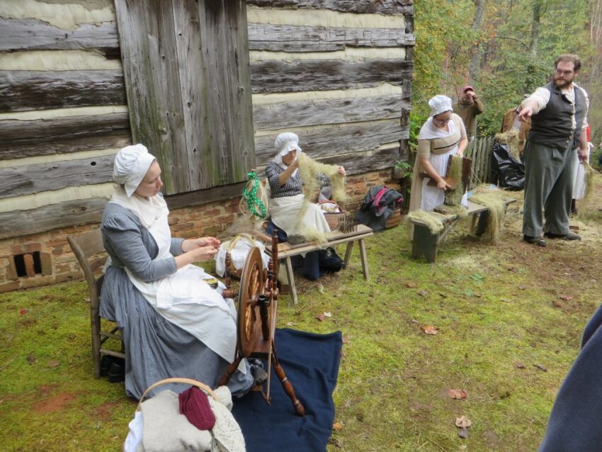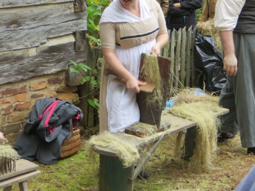 Cutting, carding, and spinning flax to make linen.