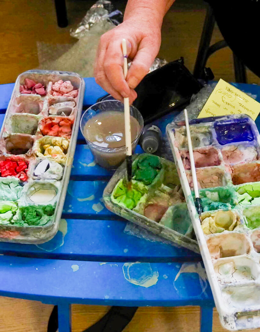 Going back to the glazes. I don’t like using the underglazes straight out of the jar. They seem slippery to me plus you use a LOT more. Instead, I put my underglazes into ice cube trays and allow them to dry out, then I reconstitute them. BTW, I do the same thing with my watercolors for the same reason.