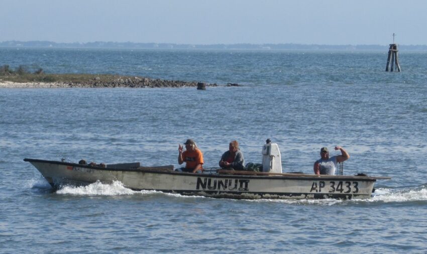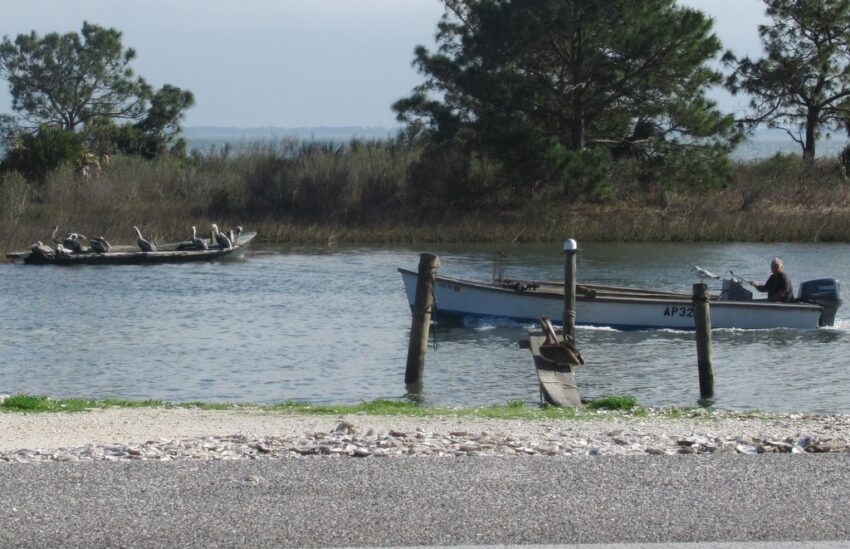 We sat on the bridge to St George Island and it was so interesting to watch this oysterman (these fishermen are called tongers) use tongs to harvest the oysters, as they have for centuries. They can fish this way because the bay is just a few feet deep.