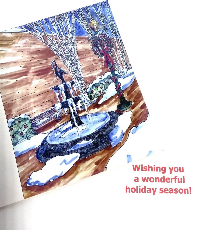 Send cozy holiday greetings with these beautiful James Reed Lane frozen fountain Christmas cards, featuring original art by Jan Francoeur.