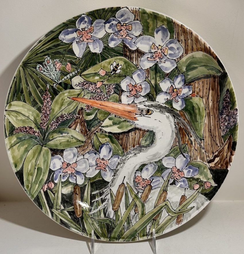 Inspired by the beauty of the Everglades, this 12″ round platter features a graceful heron surrounded by delicate orchids. Hand painted by Janet Francoeur as part of her Nature Series, the design is created using vibrant underglazes and fired to 2000 degrees for lasting color and durability.