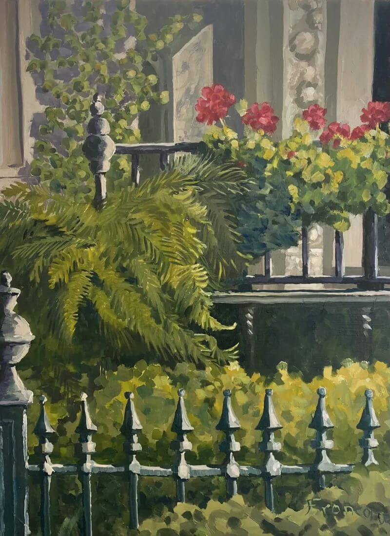Immerse yourself in the enchanting beauty of Savannah with this original oil painting, “On Savannah Square.” Capturing the essence of the city’s stunning architecture and picturesque squares, this artwork features a striking black iron fence that encloses a lush Southern garden, inviting viewers to experience the charm of this historic location.