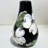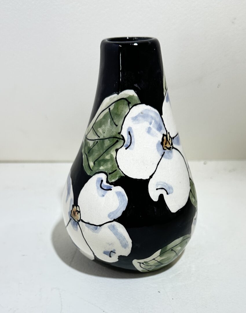 This elegant ceramic vase features Janet Francoeur’s signature hand-painted dogwood blossoms, one of her most beloved motifs. Set against a deep black background, the white dogwood petals and soft green leaves stand out beautifully, highlighted with delicate watercolor-style shading and expressive ink outlines.