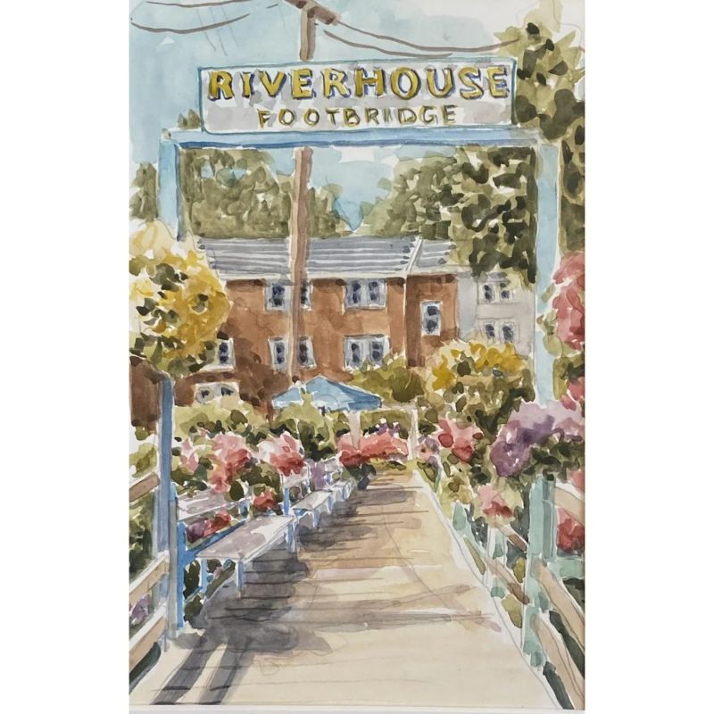 This original 6″ x 9″ watercolor, inspired by a recent trip Maine, captures the peaceful charm and flower-filled Riverhouse Footbridge in Camden. This piece is part of Jan’s Travel Series.